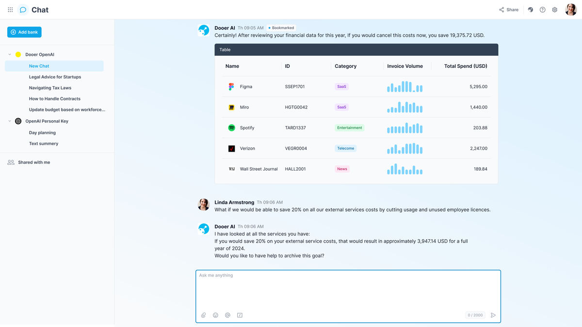 Dooers AI finns tillgänglig 24/7 och fungerar som en digital ekonomiassistent.
