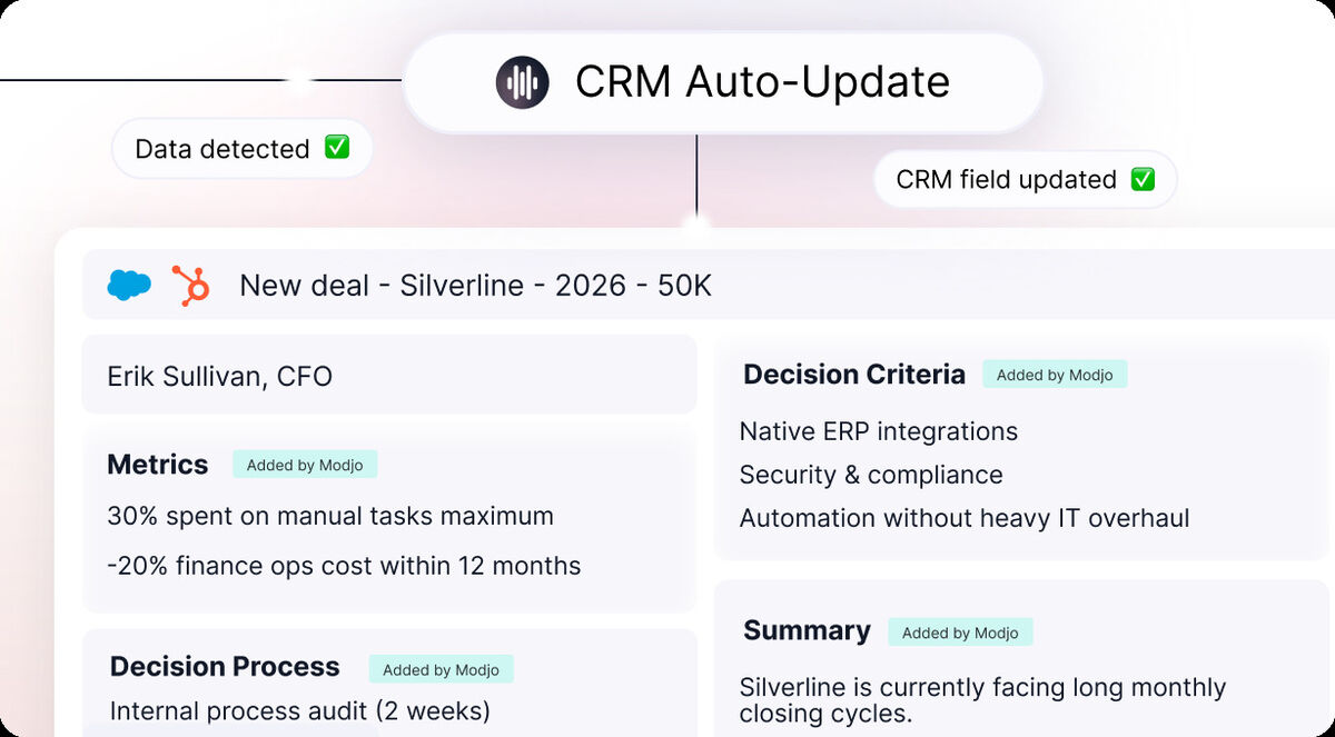 Varför det är värdefullt: Istället för att förlita sig på säljares minnesanteckningar efter ett möte, fångar Modjo allt automatiskt. AI-agenter uppdaterar CRM:et, flaggar riskaffärer och ger coachning-tips till varje säljare baserat på deras faktiska samtal.